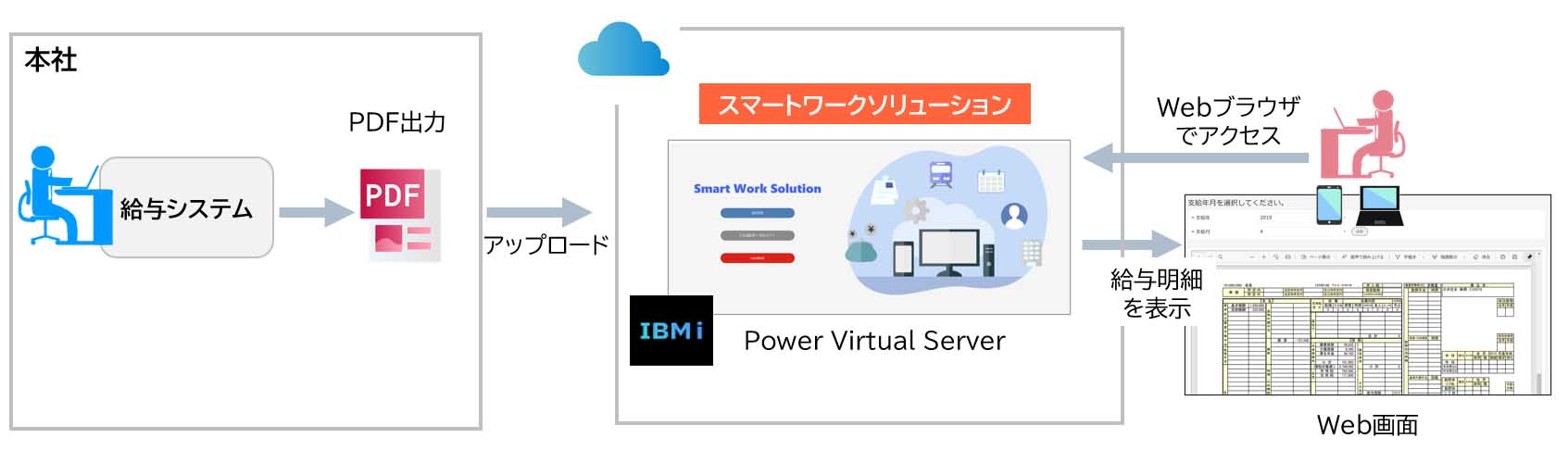 ✔ 給与明細を閲覧・照会するシステムを、実績のあるスマートワークソリューションで構築する。あわせて「Web明細照会」機能を活用する。