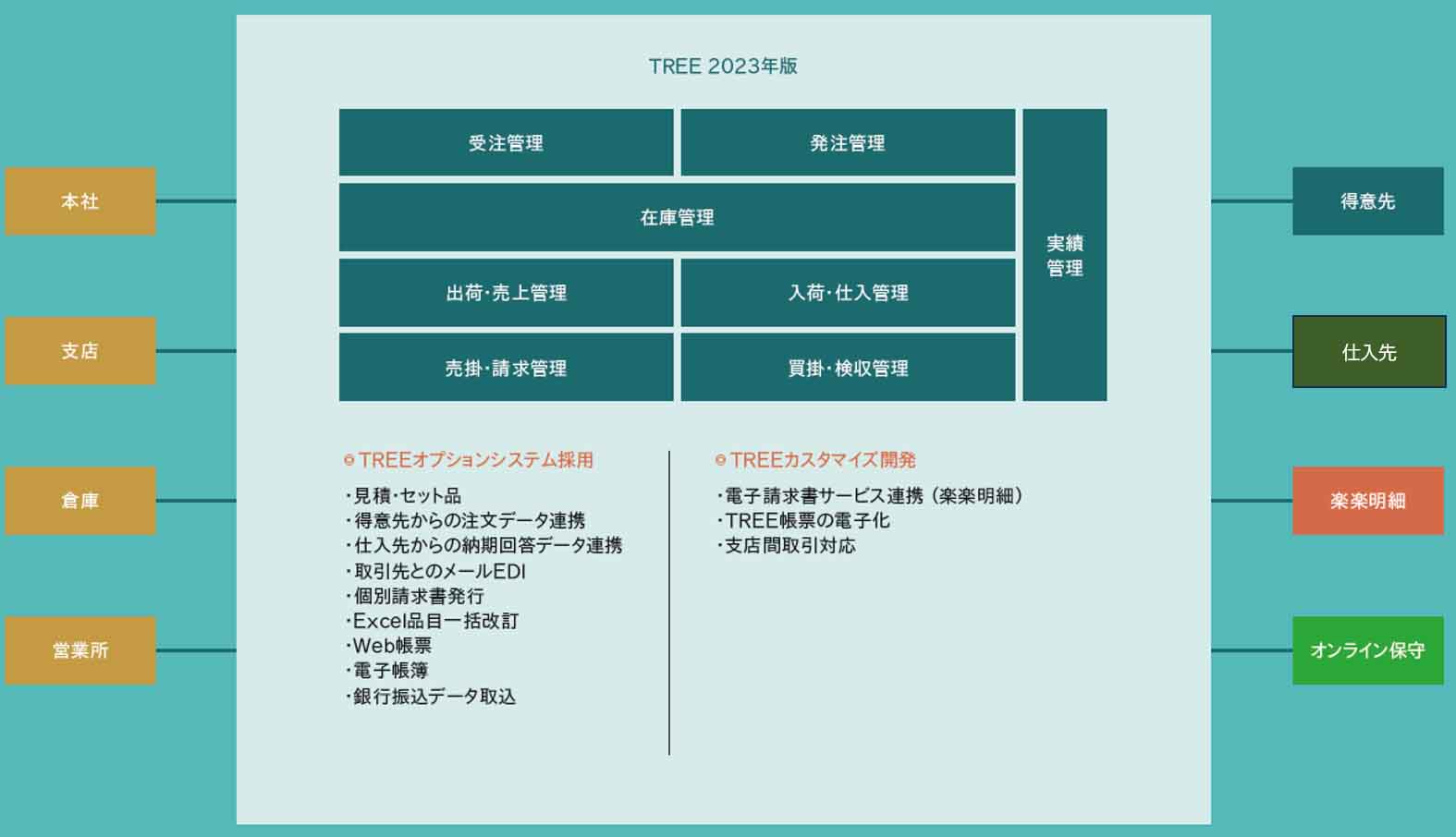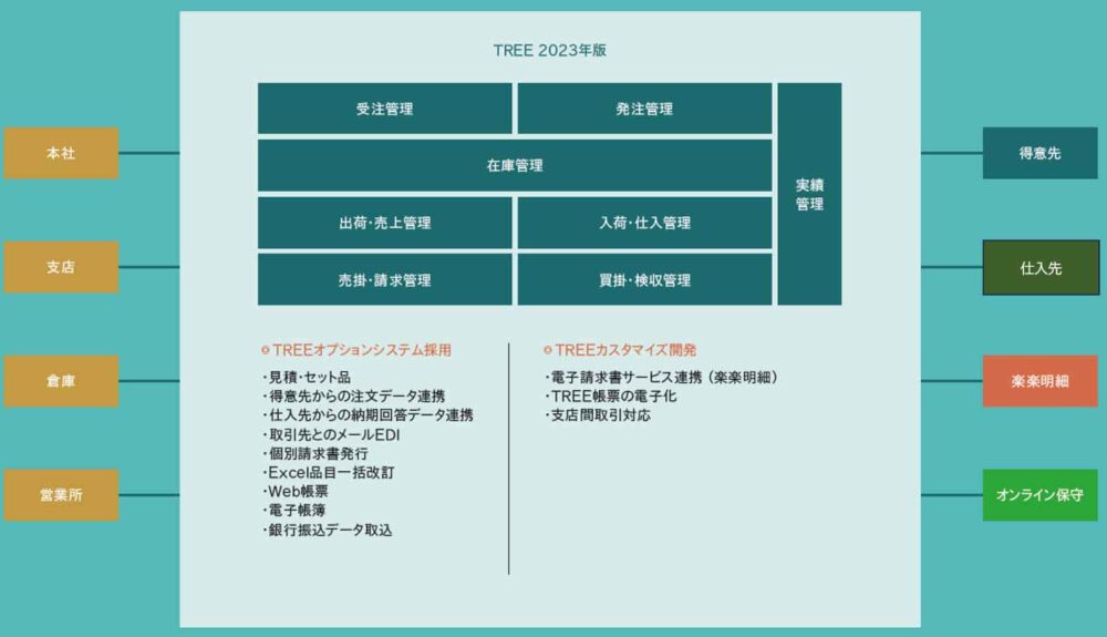 同社ではTREEの移行に際して、多数のオプションを採用するとともに(図表)、カスタマイズにより複数の機能を追加した。新規にカスタマイズにより搭載したのは、「楽楽明細」との連携、TREE帳票の電子化などの機能である。
