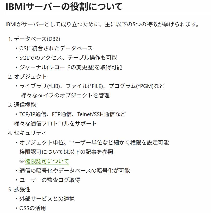 そして、このそれぞれについてまとめたものを最終的にQiitaにアップし公開しました(末尾参照)。私は、「オブジェクトの権限認可」と「IBMiのサーバーとしての役割」の2つの記事の執筆を担当しました。