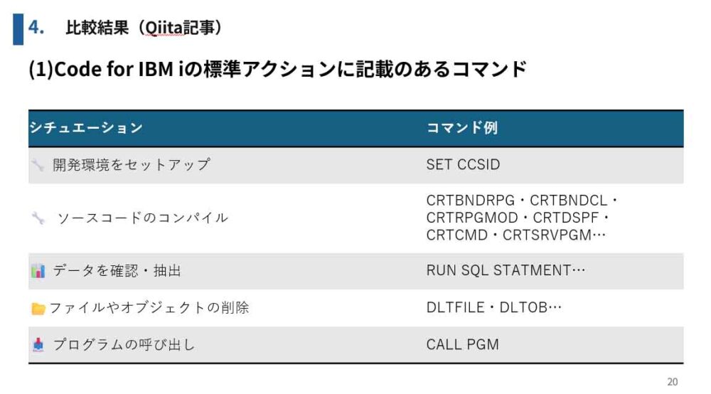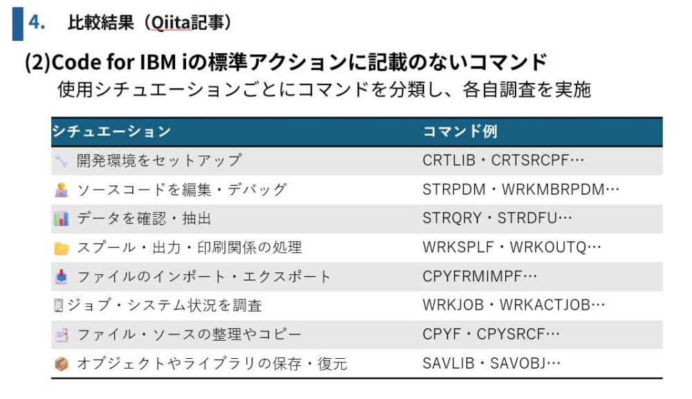Y・S 「AS400とCode for IBMiでのコマンド比較」の①~③が、「Code for IBMiの標準アクションに記載されているコマンド」とIBM iのコマンドとの比較、④~⑦が「Code for IBMiの標準アクションに記載されていないコマンド」とIBM iのコマンドの比較です。