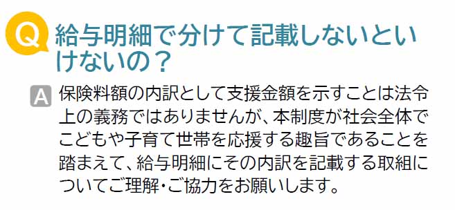 ただし、こども家庭庁では、子ども・子育て支援金制度が社会全体でこどもや子育て世帯を応援する趣旨であることを踏まえて、給与明細にその内訳を記載する取組みについて理解・協力を求めています。