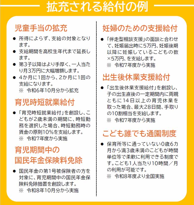 子ども・子育て支援金に基づく給付の拡充についてはパンフレットにある通りですが、主に、