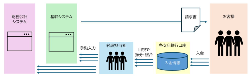 全国に販売拠点をもつサービス会社A社は、各支店のお客様からの販売代金の振込みを各支店の経理担当者が目視で照合・確認し、さらに費目ごとに振り分けて、ある費目は基幹システムへ、ある費目は財務会計システムへそれぞれ登録するという処理を行っていました。