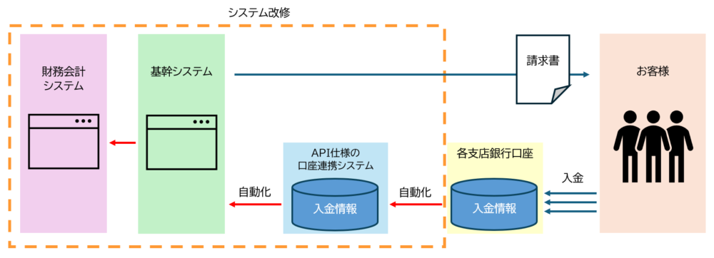 ✔ お客様から銀行口座への入金記録を、外部のAPI口座情報連携サービスの利用により、基幹システムへ自動連携する。